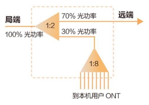 不等比分光器(如圖1)是把局端來的100%光功率信號進(jìn)行不等比例分光,70%的光功率輸出到遠(yuǎn)端,30%的光功率留用到本機(jī)用戶,再進(jìn)行等比例分光到本機(jī)用戶。雖然本機(jī)用戶僅留分了30%的光功率,但也能夠滿足本機(jī)用戶的需要。