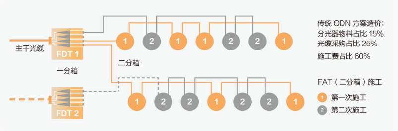 通常,一個ODN工程項目,分光器的物料及其安裝費用僅僅占了工程項目總投資的15%不到,85%以上的投資均與光纖有關(guān),光纖數(shù)量越多,物料成本和施工成本就越高。因此,不等比例分光是FTTH網(wǎng)絡(luò)的先進(jìn)技術(shù)方案,是一個革命性的大變革。