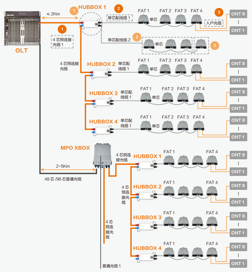 此方案(如圖9)包含三個盒子,即HUBBOX、SUBBOX、ENDBOX和三根纜,即MPO光纜、單芯配線纜、入戶光纜。每個HUBBOX對4個GPON口的纖芯進(jìn)行1:2分光,輸出8條鏈路。SUBBOX是不等比分光,可級聯(lián)4個FAT,每個FAT可連接8個用戶。離OLT較遠(yuǎn)的區(qū)域可用普通光纜+MPO XBOX方案,XBOX不僅可以直接與12芯預(yù)連接光纜相連,還可以與普通光纜連接輸出。方案全程預(yù)連接,非常適合架空場景,安裝效率高、故障率低。