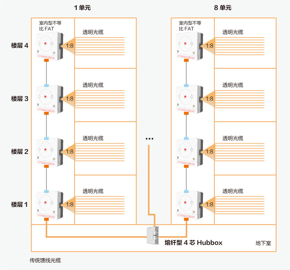 此方案(如圖11)是傳統(tǒng)饋線光纜進(jìn)樓,與HUBBOX相連,每個HUBBOX內(nèi)裝4個1:2分光器,出8條鏈路,每條鏈路級聯(lián)4個FAT,覆蓋一個單元32個用戶,比如每層樓有8個用戶,每個單元有4層,共計可覆蓋8個單元,256個用戶。